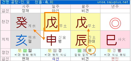 당연히 용신은 화오행이 되고, 희신은 화오행과 생조관계에 있는 토오행이 됩니다.