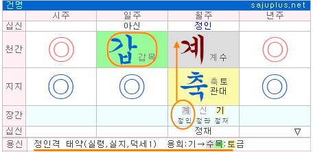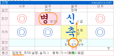 월간의 경금은 앉은자리 신금의 응원을 받아 힘이 강합니다. 월간 경금의 강한 힘을 일간 갑목이 받아드려야 우너만한 생활이 되지만, 일간 갑목도 앉은자리 상관인 오화를 두고 있어 일간이 보살피고 생조해야 하는 십성이며, 사회적으로는 일간 갑목의 재물입니다.