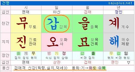 4.비겁용재격 위의 비겁용식상격과 유산한 경우로 재성을 용신으로 하는 경우를 말합니다. 비견격의 신강사주이면 건록용재격, 겁재격 신강사주이면 양인용재격으로 부르기도 합니다.