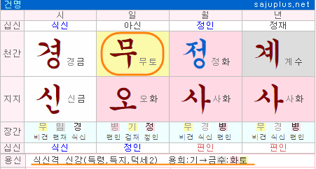 2.식상생재격 신강한 명조가 재성을 용신으로 정하고, 식상이 재성을 생조하는 명조가 됩니다. 식신이 생조하는 경우는 식신생재격, 상관이 생조하는 경우는 상관생재격이라 합니다.