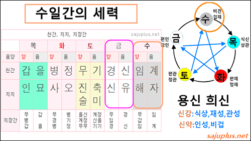 일간인 수오행과 같은 비겁인 수기운과 인성인 금기운이 세력입니다.