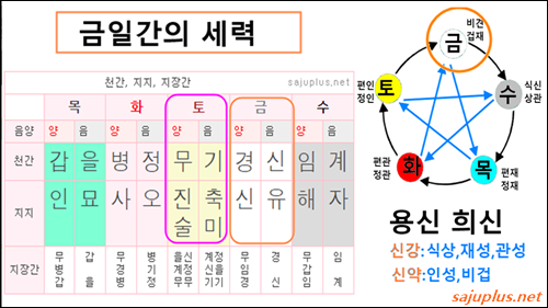 일간인 금오행과 같은 비겁인 금기운과 인성인 토기운이 세력입니다.