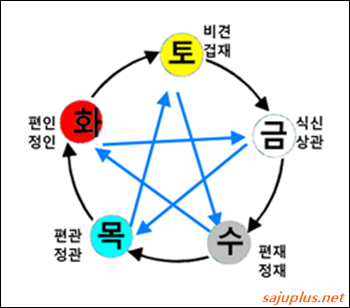 위 그림은 일간이 토오행인 경우 비견과 겁재, 식신과 상관, 편재와 정재, 편관과 정관, 편인과 정인의 되는 오행들을 도표로 나타낸 것이니, 잘 이해해 두시면 좋습니다.