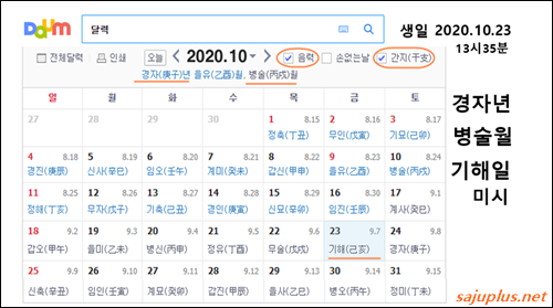상단 부분에서 [음력]과 [간지] 부분을 체크하시면, 위처럼 양력과 음력, 간지가 함께 출력이 됩니다. 여기서는 오늘 날짜인 양력 2020년 10월 23일 13시 35분에 태어난 사람의 사주팔자를 확인해 보기로 합니다.