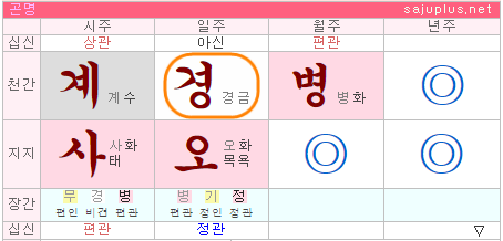 자식인 계수 입장에서는 자신에게 도움이 되지 못하는 모친 경금이 원망스럽고, 부친에 해당하는 편관 병화도 원망스럽습니다. 이런 명조의 경우 경금여성은 남편복, 자식복이 모두 박한 명으로 판단합니다.