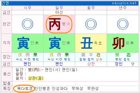 이런 명조에서는 약한 기운인 화오행에 해당하는 십성과 해당 궁위에 문제가 생깁니다. 화오행에 해당하는 십성이 정재라 재물운이 부족하기 쉽고, 해당 궁위가 연지라 조상과 인연이 부족하다고 해석을 합니다.