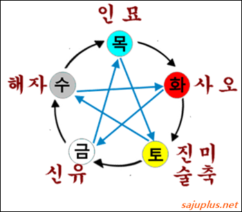 상생의 관게에서는 생하는 오행이 생을 받는 오행보다 우위에 있다고 봅니다. 수오행인 임수나 계수는 목오행인 갑목이나 을목보다 우위에 있고, 목오행은 화오행보다 우위, 화오행은 토오행보다 우선 순위에 둡니다. 마찬가지로 토오행은 금오행 보다 우위에 있고, 금오행은 수오행보다 강하다고 봅니다.