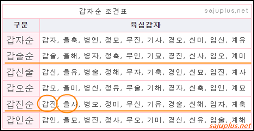이번에는 갑자순 조견표를 참조하시면 됩니다. 위 조견표에서 생갑순에 해당하는 갑술순과 갑진술에 해당하는 간지가 어떤 것인지를 확인해 역시 달력에 표시를 하면 됩니다.