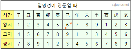 양둔일의 왕지는 위 표와 같이 자시가 1백수성, 축시가 2흑토성, 인시가 3벽목성 .. 등으로 순행합니다. 위 예시에서는 출생시가 사시이므로 6백수성이 됩니다.