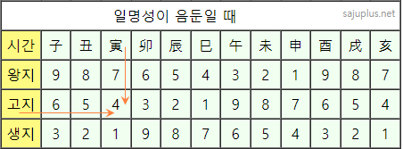 일명성이 음둔이고 고지에 속하는 사람은 위 도표처럼 자시가 6백수성, 축시가 5황토성, 인시가 4록목성 등으로 숫자가 감소하며서 진행합니다. 일명성이 음둔이고, 지지가 고지이니, 인시는 사록목성이 됩니다. 이처럼 감소하면서 진행하는 것을 음둔이라 합니다.