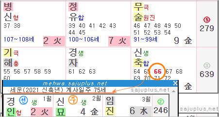 위 그림은 [66]으로 표시된 나이 부분을 클릭하여 세운을 살펴본 화면입니다. 표시는 66으로 되어 있지만 실제로는 75세인 신축녕의 운세를 표시하는 것으로 나옵니다.