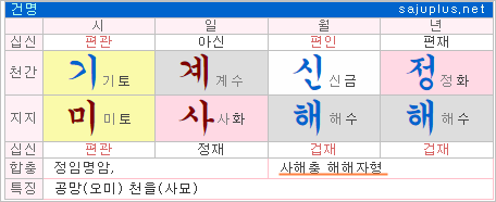 월지와 일지가 사해충이면 생지의 충이라 역마의 기운이 포함됩니다. 또한, 월지는 부모궁, 일지는 배우자 궁으로 고부간에 갈등이 있을 수 있습니다. 일찍 결혼을 하게 되면, 배우자와도 함께하기 힘든 경우가 될 수도 있습니다.