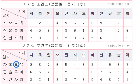 일지가 음둔일이면서 왕지에 속하는 묘목이니, 위 도표에서 찾으면 시구성은 사록목성이 됩니다.