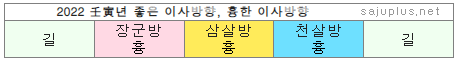 2022년 임인년은 인오술 삼합에 해당하여 중심기운인 오화 즉 남방의 반대계절인 북방이 삼살방위가 됩니다.