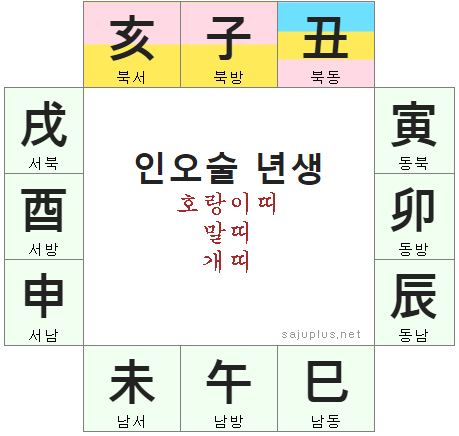 인오술생(호랑이띠, 말띠, 개띠)이면 북동쪽 방향이 됩니다.