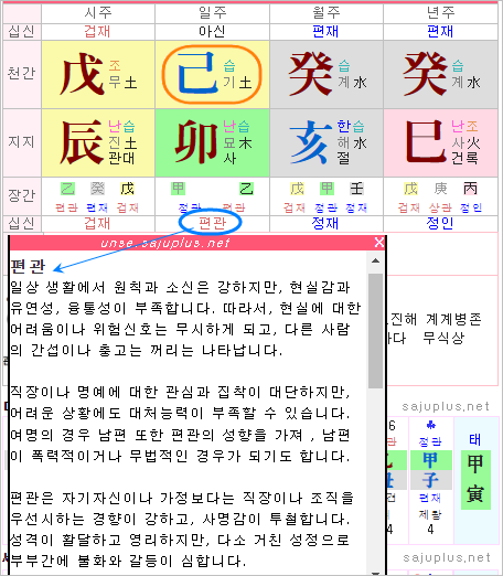 외관상으로 느끼는 이미지일 수도 있고, 성장기의 환경일 수도 있습니다. 연간이 편재이면 허세가 심하거나 과시욕이 강하고, 국제적인 일에 관심이 많을 수도 있습니다. 연지가 정인이면 조부대에 학자 집안이거나 학문을 좋아하는 환경일 수 있습니다.
