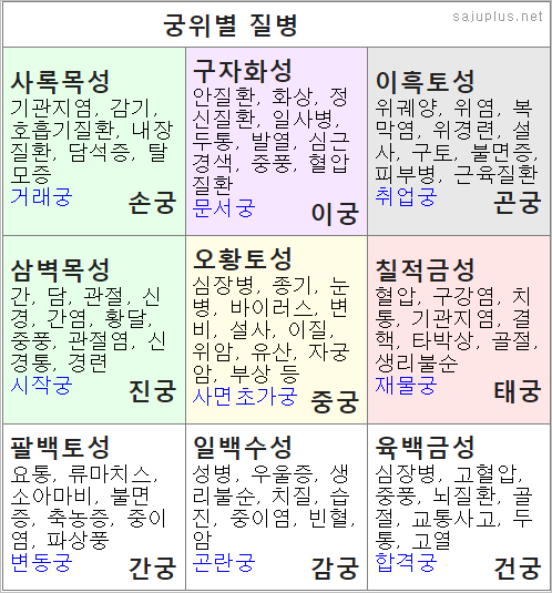 이 경우 태궁이 질병에 노출되기 쉬운 궁위가 아니라, 태궁에 동회한 상수 6이 문제가 됩니다. 따라서, 태궁이 아닌 상수 6의 피동회에 해당하는 건궁에서 해답을 찾으시면 됩니다. 이 부분은 추후, 좀 더 쉽게 이해를 하실 수 있도록, 구궁과 구성의 해설부분을 보강토록 할 것입니다.