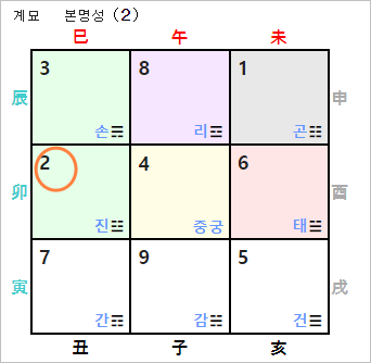 플러스방위력으로 구성별 흉살에 따른 질병관계를 판단하시는 경우는, 해당 구성의 정위반에 따른 구궁으로 확인하시면 됩니다. 예컨데 아래 예시들이 경우로 보시면 계묘년의 경우는 묘유충에 해당하는 태궁이 파살입니다.