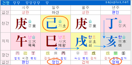 일지가 정인이면 체면이나 명예를 중시하고, 아내가 모친처럼 자상하게 보살펴 주기를 바라는 성향이지만, 일지가 포함된 원진살은 배우자와의 불화가 기본적으로 포함됩니다. 일지 사화가 겁재인 월지와 원진관계라 친구나 동료에게 아내를 뺏기는 경우도 생기는 명운입니다.