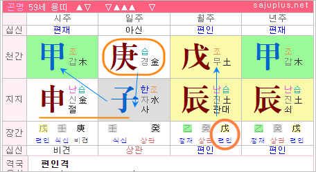 위 명조는 진월에 태어난 경금일간의 여명사주입니다. 월지 진토의 지장간 중의 정기인 무토가 월간에 투출하여 편인격인 명조입니다. 경금은 원석이지만, 태어난 달이 진월이라, 원석의 역할을 제대로 하기 힘듭니다.