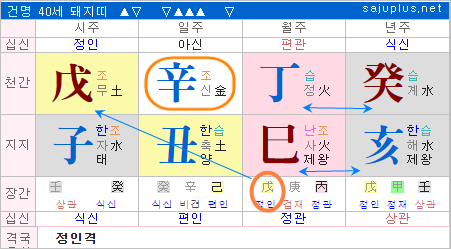 월지 사화의 여기인 정인 무토가 시간에 투출하여 정인격인 명조입니다. 그러나, 월지 사화가 시간의 해수와 사해충이 되고, 월간 정화는 시간의 계수와 정계충이 됩니다. 따라서, 월지 사화는 본연의 역할을 하기 힘들어, 이 명조의 경우 정인격이 파격이 된 경우입니다.