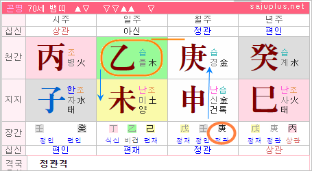 월지 신금의 지장간 중의 정기인 경금이 월간에 투출하여 정관격인 명조입니다. 을목 여성에게 월간의 정관 경금은 남편에 해당합니다. 남편인 정관 경금은 동주한 지지 신금에 뿌리를 두어 힘도 있고, 을경합으로 상당히 부부간의 금슬이 좋은 편에 속합니다.