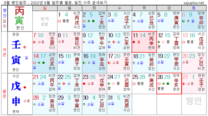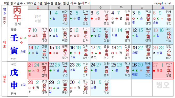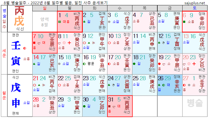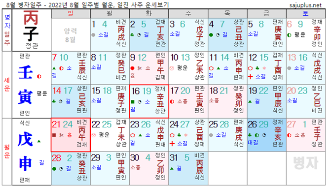 병화일간 8월운세-2022년 8월(무신월) 일주운세 월운세, 일진운세 사주보기 운세보기