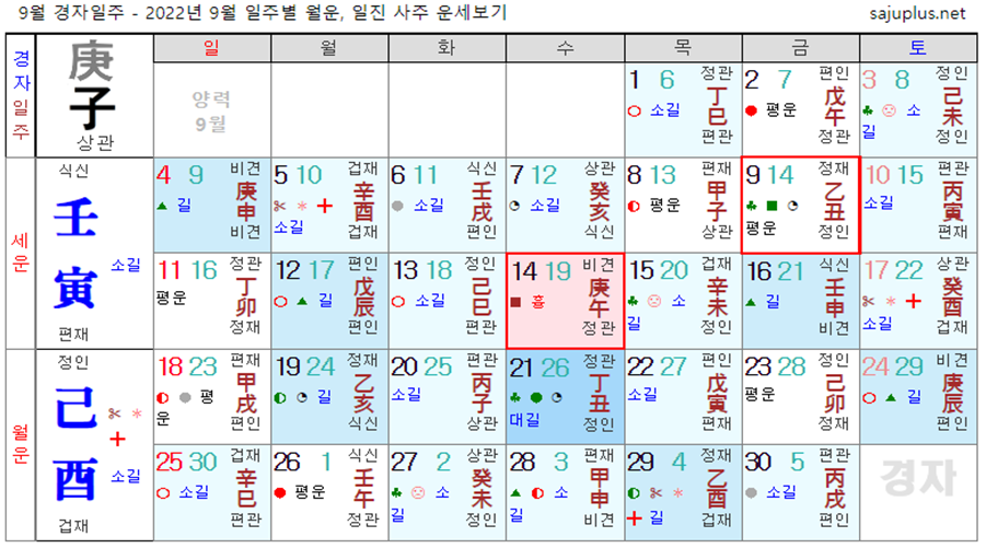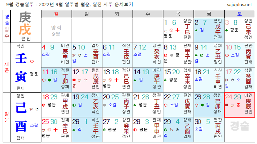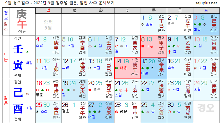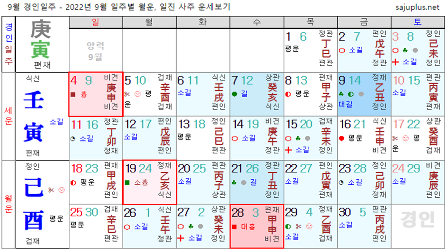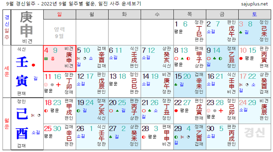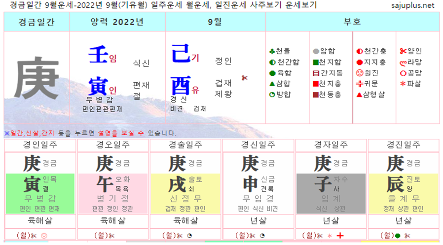 경금일간 9월운세-2022년 9월(기유월) 일주운세 월운세, 일진운세 사주보기 운세보기