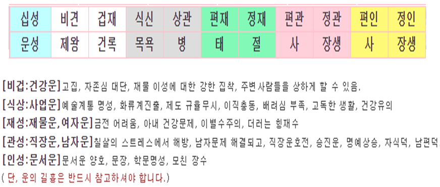 편관이 사지라 그동안 자신을 누르던 압박이나 스트레스로부터 벗어나는 시기입니다. 여명의 경우 시달리던 남자 문제가 해결되는 시기이기도 합니다. 정관이 장생이라 직장운이나 명예가 상승하는 시기라 승진, 승급 등의 좋은 소식도 따르게 됩니다. 여명의 경우 남편덕이 큰 시기라 남편의 승진이나 부서 이동 등으로 인해, 사모님 소리를 들을 수도 있고, 남명의 경우 자식으로 인해 주변 사람들의 부러움을 받는 시기일 수도 있습니다.