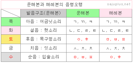 1750년(영조 26년) 신경준에 의해 훈민정음 운해본이 필사본으로 전해지다가, 1938년 조선어학회에서 단행본으로 발행됩니다. 그 후 우리나라 작명계에서 대부분 운해본의 음령오행 체계를 따르고 있습니다.