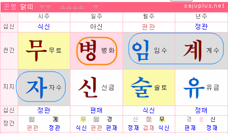 2).정관과 편관이 각기 한개 이상 천간이나 지지에 몰려서 존재해야 합니다. 천간에 정관, 지지에 편관이 한개씩 존재하는 경우나, 그 반대의 경우는 관살혼잡으로 보지 않습니다.