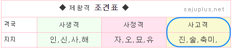 지지에 고지인 진술축미가 모두 구비된 경우는 사고격, 생지인 인신사해가 모두 있는 경우는 사생격, 왕지인 자오묘유가 모두 있는 것은 사정격이라 하며, 제왕격 사주로 일컬어 집니다.