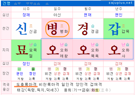 위 명조는 병오일주의 명조에서 연지, 월지, 일지가 모두 오화이고, 원국에 관성이 존재하지 않아 도충록마격이 된 경우입니다.