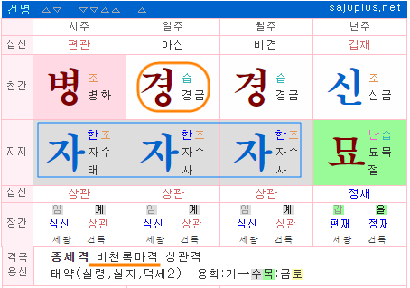 위 명조는 시간에 편관인 병화가 존재하지만 상관인 자수로 제화되어, 비천록마격이 성격된 경우에 해당합니다.