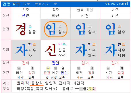 위 명조는 인성과 비겁으로 이루어진 명조입니다. 일지와 시지가 신자진 반합으로 수국을 이루게 되어 사주의 대부분이 인성인 종왕격의 명조가 됩니다.