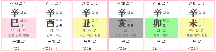 신묘일주는 자묘형살이라 물질적으로나 정신적으로 어려움이 따를 수도 있으니, 건강관리 신경을 써셔야 합니다. 신미일주은 원진살로 부부간이나 이성간의 교제에서 상대방의 마음에 상처되는 일이 생기지 않도록 유의해야 합니다.