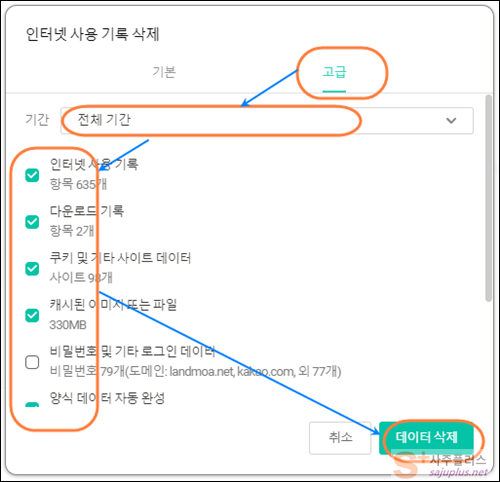 하단의 선택 옵션에서는 [비밀번호 및 기타 로그인 데이터] 항목을 제외한, 모든 항목을 선택합니다.