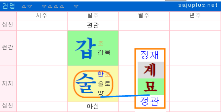 갑술일주의 경우 편재인 일지 술토가 갑목일간의 아내입니다. 아내인 일지 술토의 입장에서 합이 되는 정관 묘운도 일간 갑목의 결혼운이 됩니다.