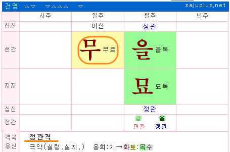 위와 같은 명조에서 정관 을묘를 무토일간의 자식으로 판단하면, 당연히 오류가 발생하게 됩니다.