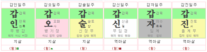 갑인일주는 간지동이라 가까운 사람들의 배신이나 함정, 사기수에 주의해야 합니다. 갑오일주는 삼합이라 친구나 동료들의 도움이 큰 달이 됩니다.
