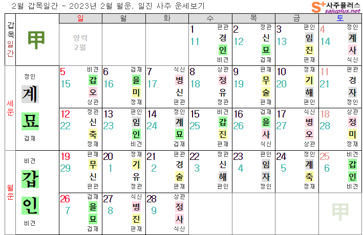 2월 갑목일간 운세 - 2023년 2월 계묘년 갑인월 갑목일간 년운, 월운, 일진 사주 운세보기
