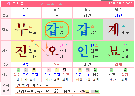위 명조처럼 기토여성의 명조에서 월간에 편관 을목이 존재하는 경우, 일찍 결혼을 하게 되면 갈등과 불화가 잦게 됩니다. 그러한 가운데, 을목 여성이 고개를 돌려보면 자신의 이상형인 갑목 남성이 기다리고 있는 명조입니다.