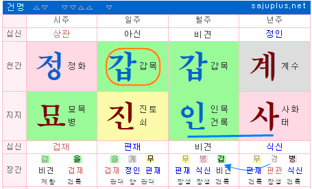 양일간인 갑목이 인월에 태어나 건록격이 됩니다. 또한, 월지 인목의 지장간 중 정기인 갑목이 월간에 투출하여 비견격도 이룹니다. 아울러 월지 일지 시지가 인묘진 방합 목국을 이루게 되어 비견급으로 보기도 합니다.