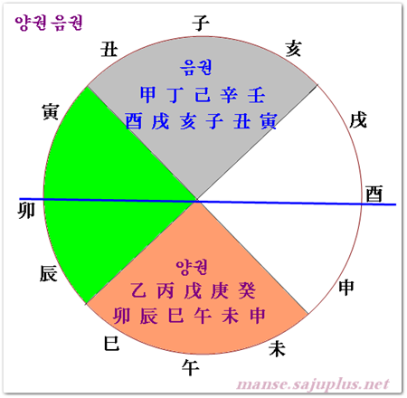위 명조의 그림에서 일간 갑목이나 시간의 정화처럼 북청색 글자로 이루어진 오행은 음권에 속하고, 연간의 계수나 연지 사화처럼 자주색으로 표시된 오행은 양권입니다. 음권과 양권은 오행의 음양과는 차이가 있는 이론입니다.