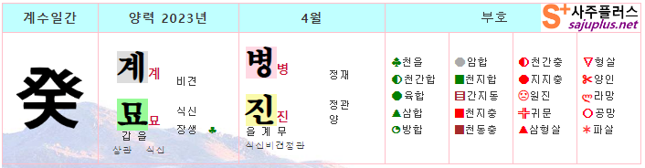 계수일간의 2023년 4월달 일진입니다. 중요한 날, 특히 주의해야 하는 날만 표시해 드리니, 하단의 합,충,형,원진 등의 도표와 첨부한 링크를 참조하셔서 확인하시기 바랍니다.