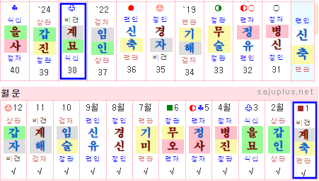 그러나, 세운과 월지가 사유축 반합의 기운이라 주변사람들의 도움을 받거나 함께 일을 추진한다고 봅니다. 당연히 직업적인 부분에서는 유리한 시기입니다.