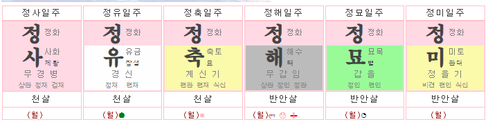 정해일주는 원진귀문에 라망살입니다. 직장이나 가정에서 고민이 따르는 일이 생기기 쉽고, 정묘일주는 방합이라 형제, 자매나 가까운 친구들의 도움이 큰 한달입니다.
