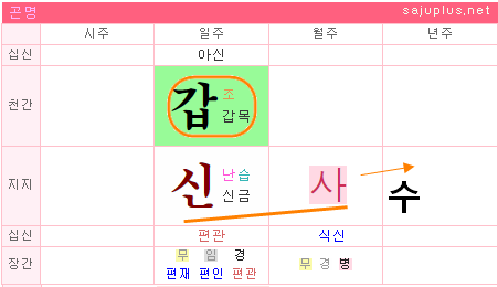 일지 신금은 일간 갑목을 금극목으로 극하는 오행이면서 일간과 음양이 같은 경우라 편관에 해당합니다.