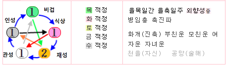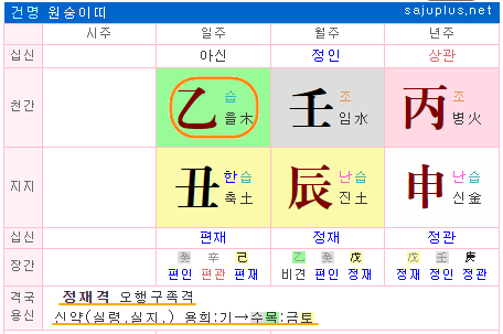 을목일간이 자기계절인 진월에 태어났지만, 도움을 주는 인성인 임수는 병임충으로 꺠지게 되어 신약한 명조로 봅니다. 신약한 명조의 용희신은 인성과 비겁인 수오행과 목오행이 해당되고, 화오행, 토오행, 금오행은 모두 기신에 해당합니다.