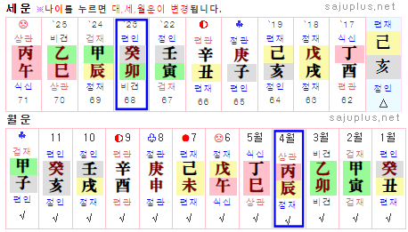 세운도 천간과 지지가 용신운이라 좋습니다. 다만, 원숭이띠, 쥐띠, 용띠 분들에게는 눌삼재에 속하는 시기입니다. 삼재에서는 병원치료, 운전, 건설현장 같은 사고 위험이 있는 일들은 상당히 조심을 해야 합니다. 다만, 월운은 천간과 지지가 모두 기신이라 흉운입니다.